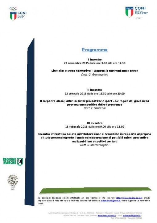 Le iscrizioni dovranno essere effettuate on line tramite il sito internet http://www.marche.coni.it previa registrazione all’ Area riservata o inviando una mail all’indirizzo srdsmarche@coni.it entro il giorno 19 novembre 2015. Gli incontri intendono implementare un percorso di crescita personale e professionale dei partecipanti attraverso attività di sviluppo delle competenze emotive, relazionali e cognitive che possono risultare utili nel contesto sportivo con attività specifiche concordate tra operatori, allenatori, dirigenti e tutti quelli che operano a contatto dei giovani. Destinatari: Il convegno è rivolto ad allenatori, istruttori sportivi, docenti e studenti di Scienze Motorie, docenti Licei sportivi, atleti e dirigenti sportivi. Sedi: Provincia di Pesaro: Sala Consiglio Provinciale, Via Gramsci, 4